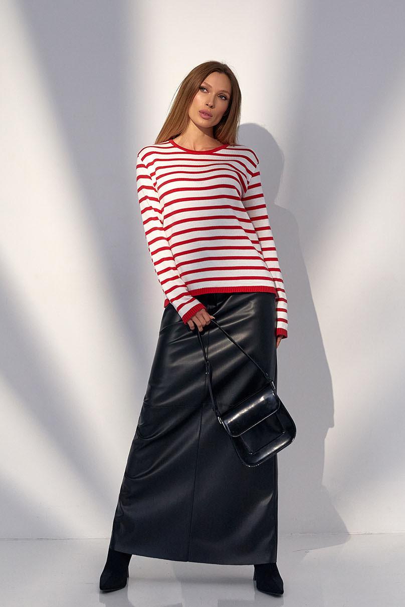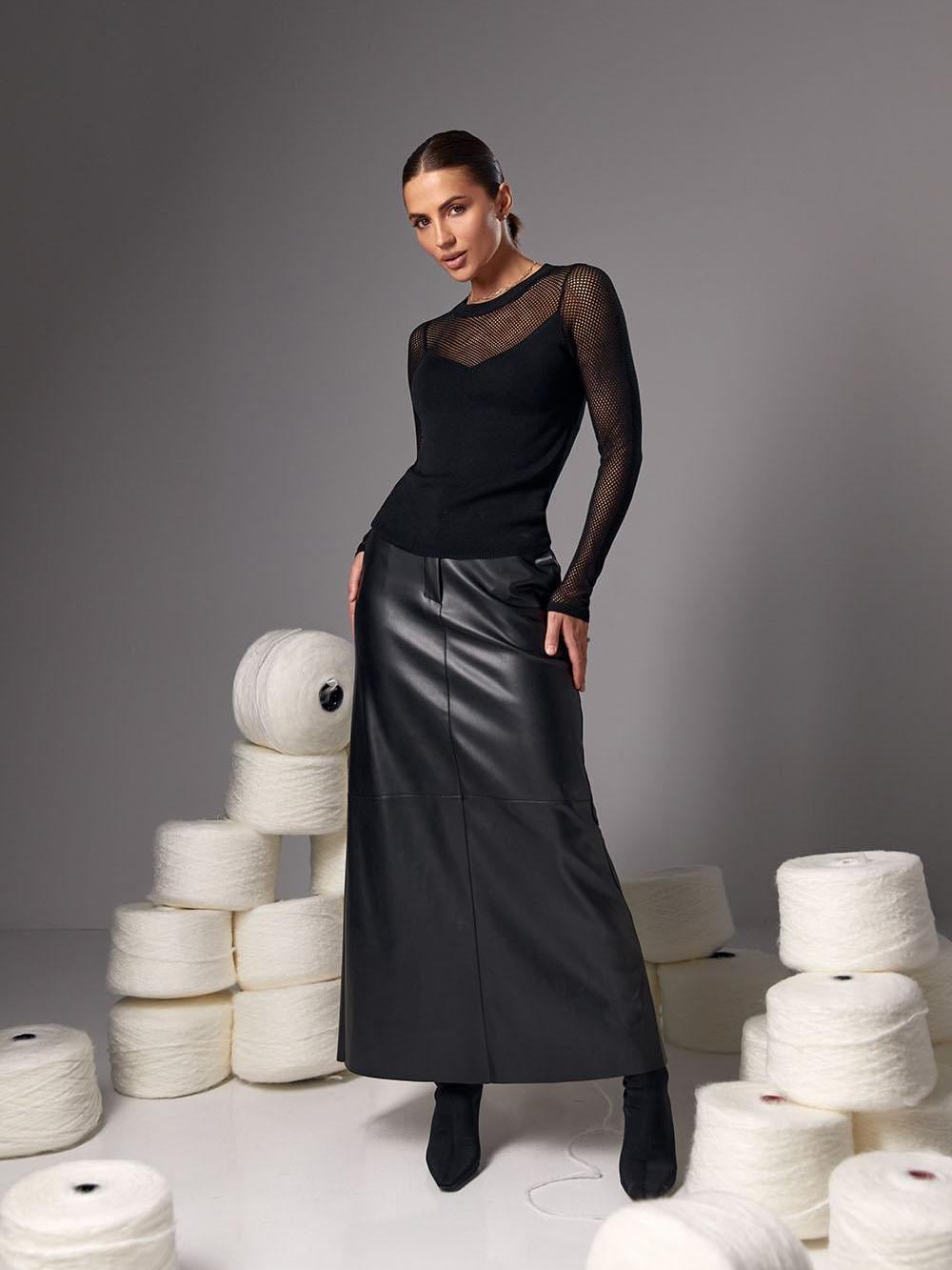 Maxi skirt made of eco-leather. It has a zipper a button on the back and an elastic waistband for maximum comfort. A neat cut provides ease of movement. It goes well with knitted jumpers, sweaters, and classic shirts.