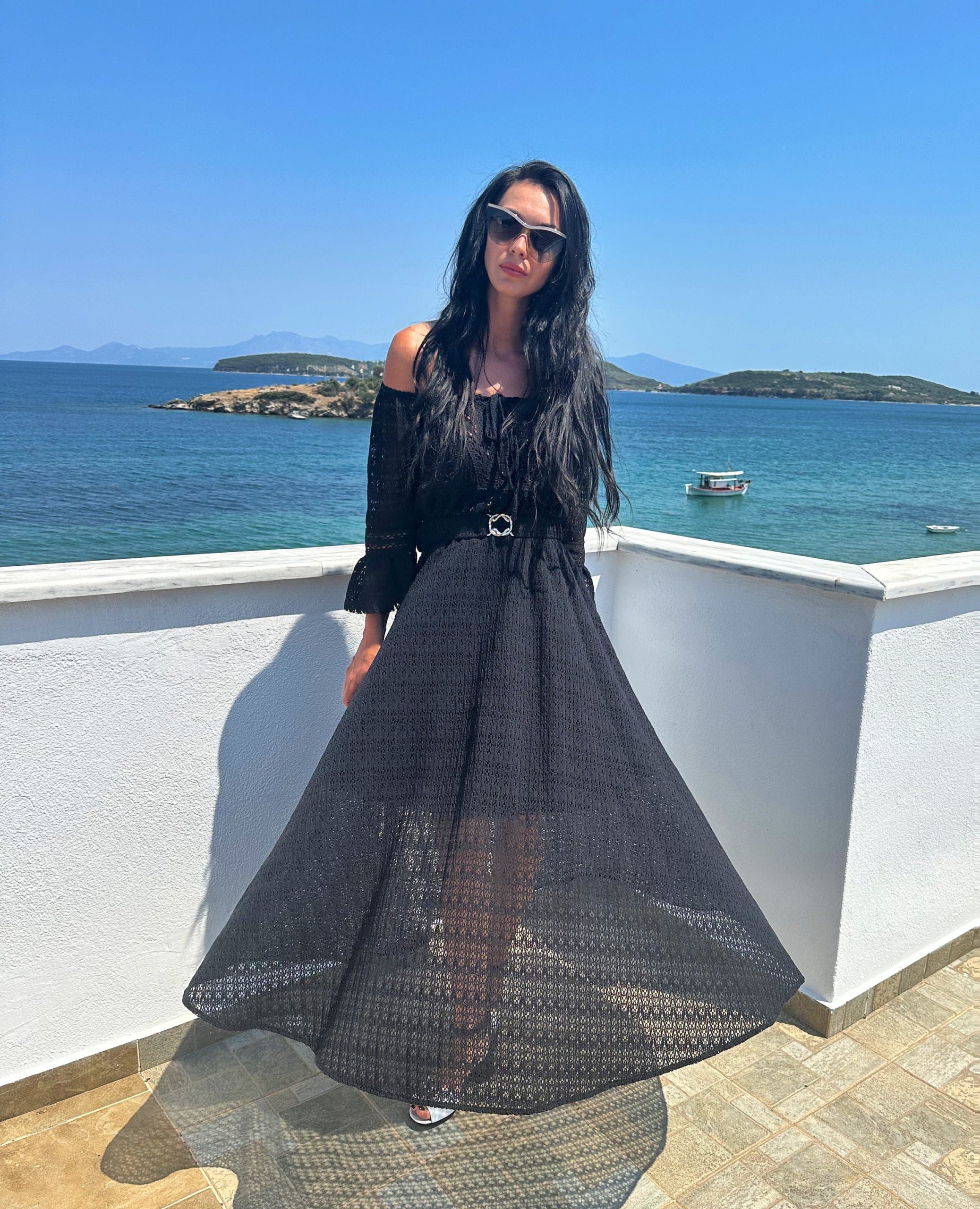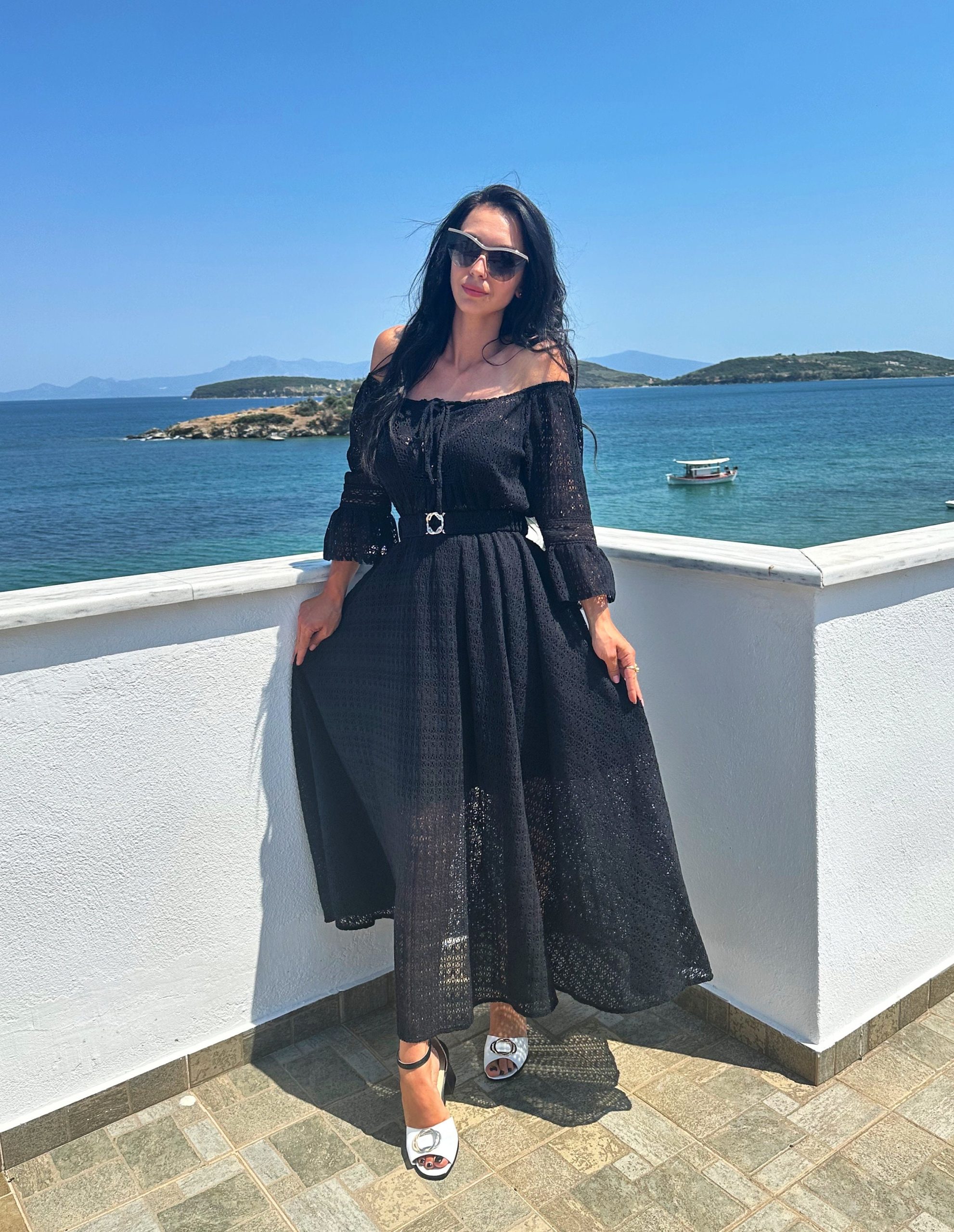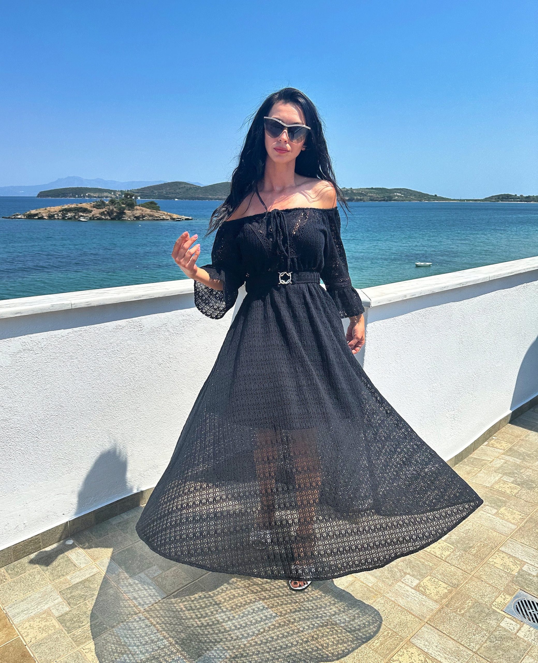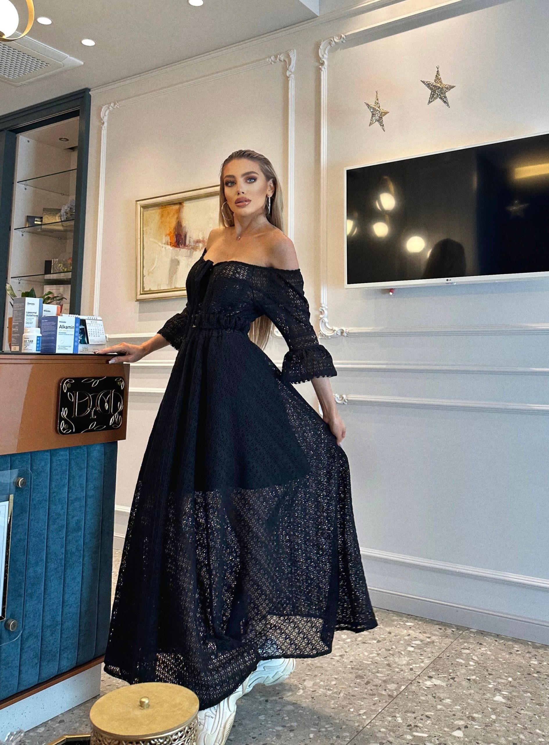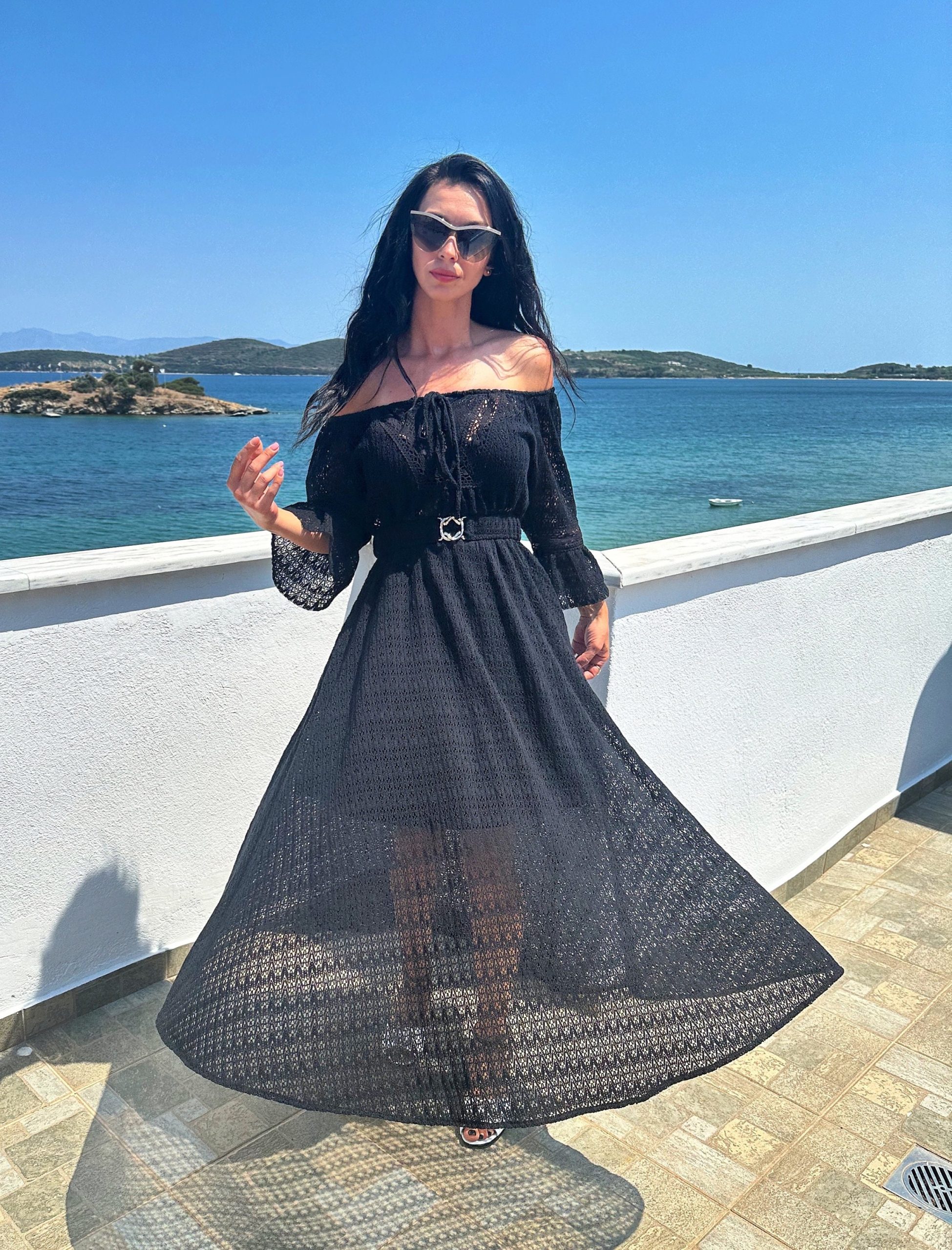Make a statement with this stunning black off-shoulder maxi dress, crafted from sheer lace fabric with elegant long sleeves and a flattering waistline. The dress features a romantic and feminine silhouette, perfect for formal events, weddings, parties, or a boho-chic evening look. The transparent lace adds a delicate touch, while the flared sleeves and flowy length bring movement and grace.