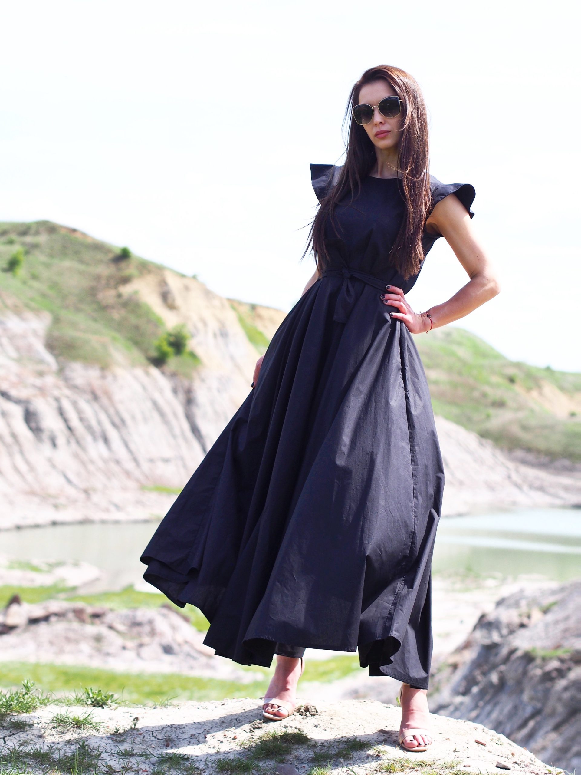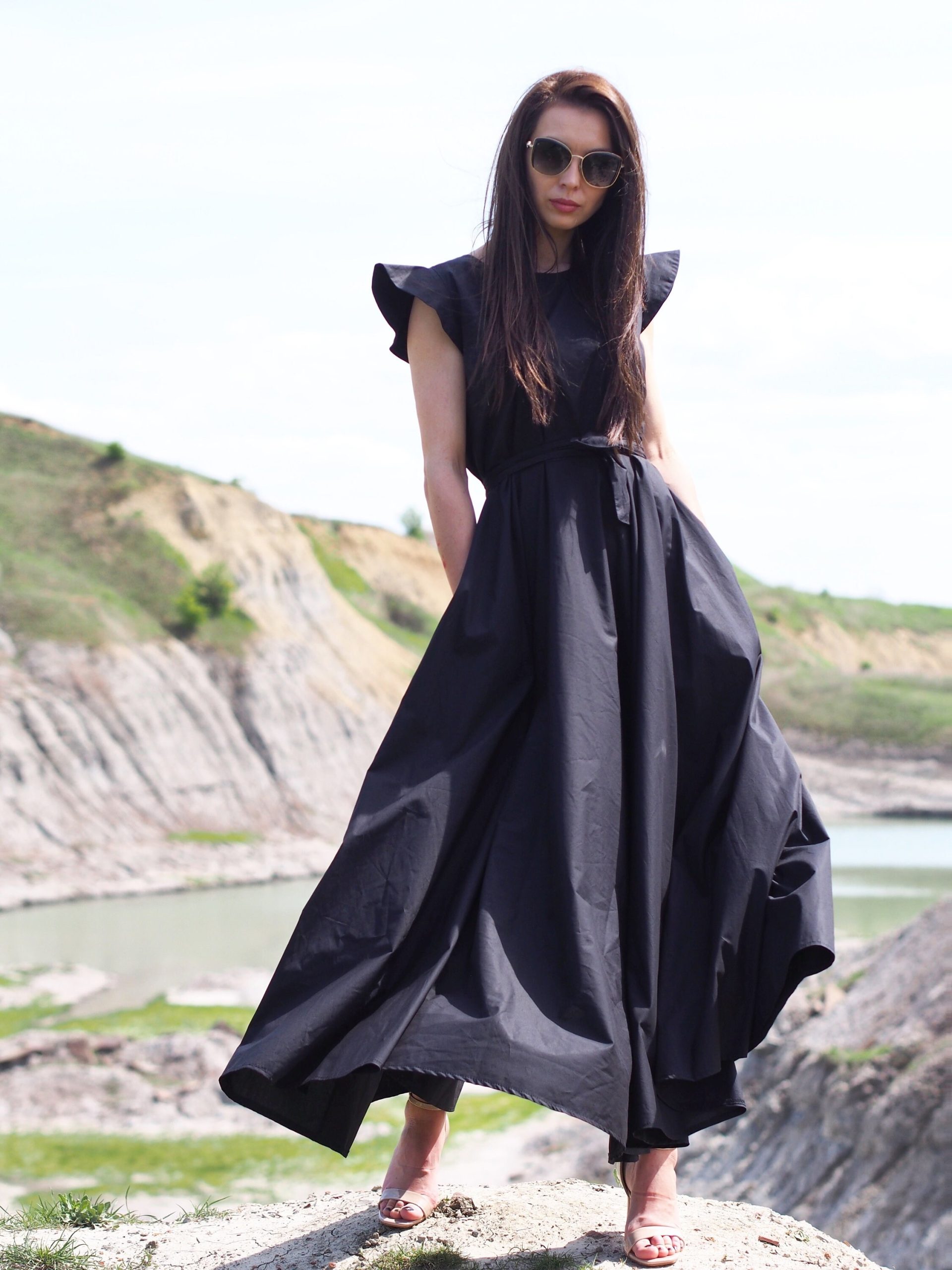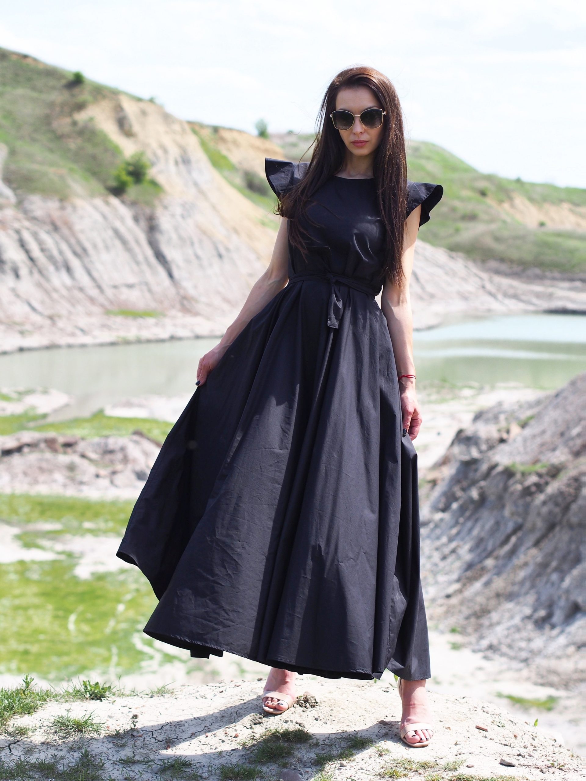 This elegant black maxi dress is a bold and graceful statement piece, crafted for women who want to stand out. Featuring dramatic ruffle sleeves, a fitted waist with a removable fabric belt, and a beautifully flared, voluminous skirt, this dress brings timeless sophistication to any event.