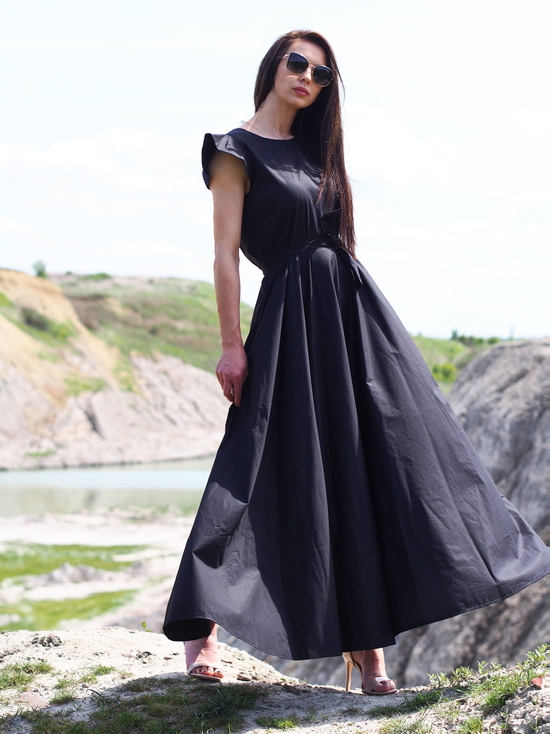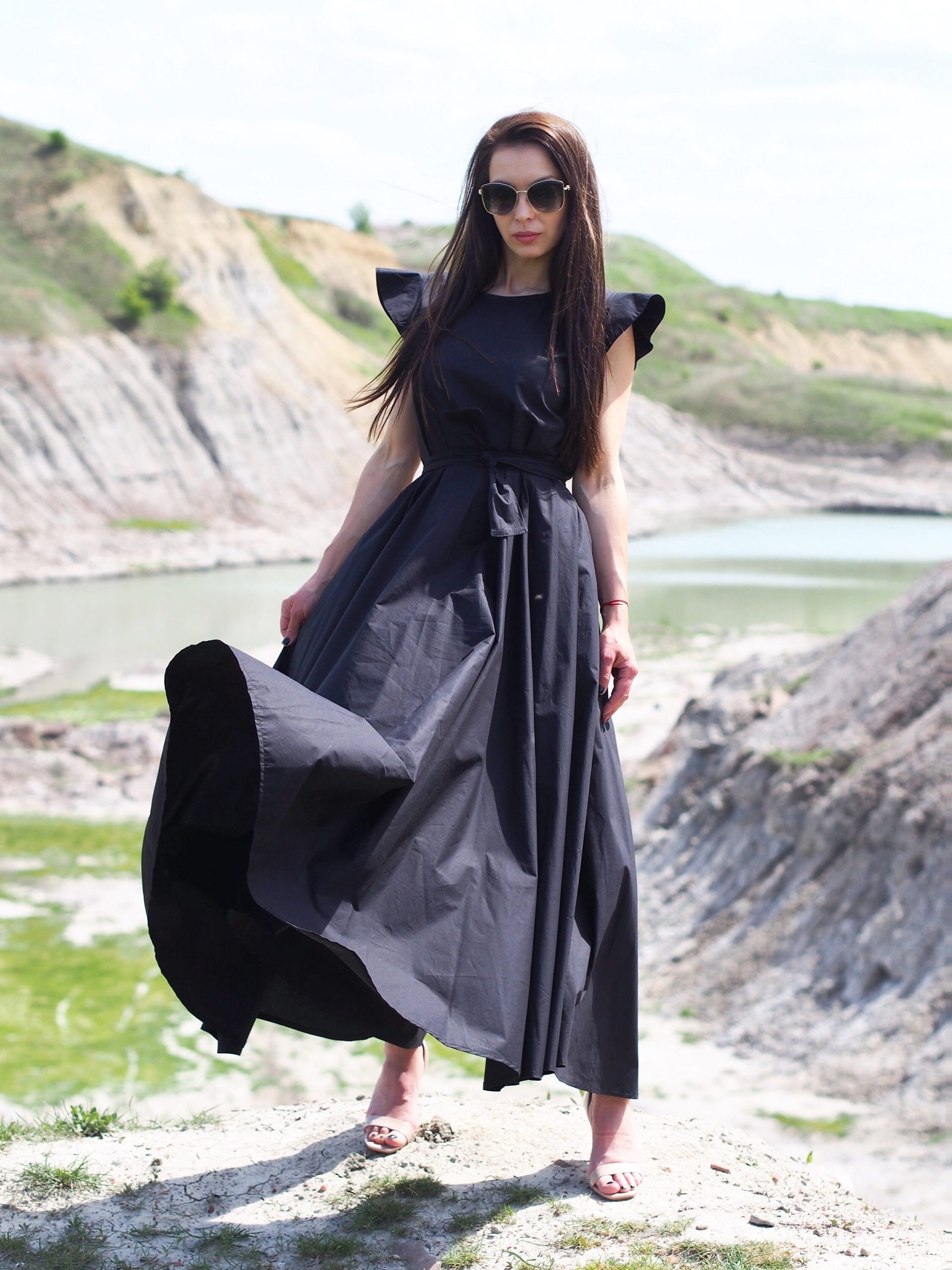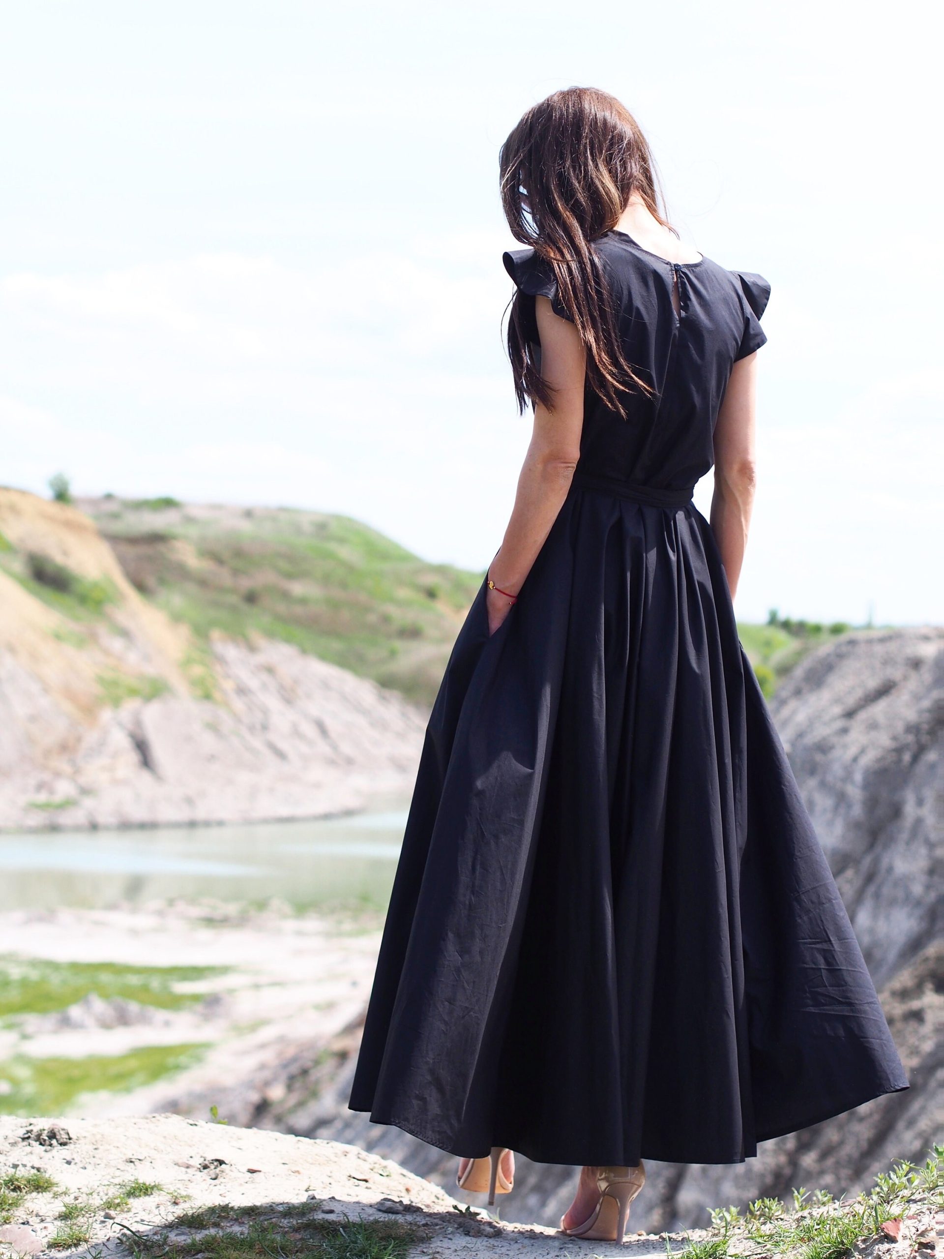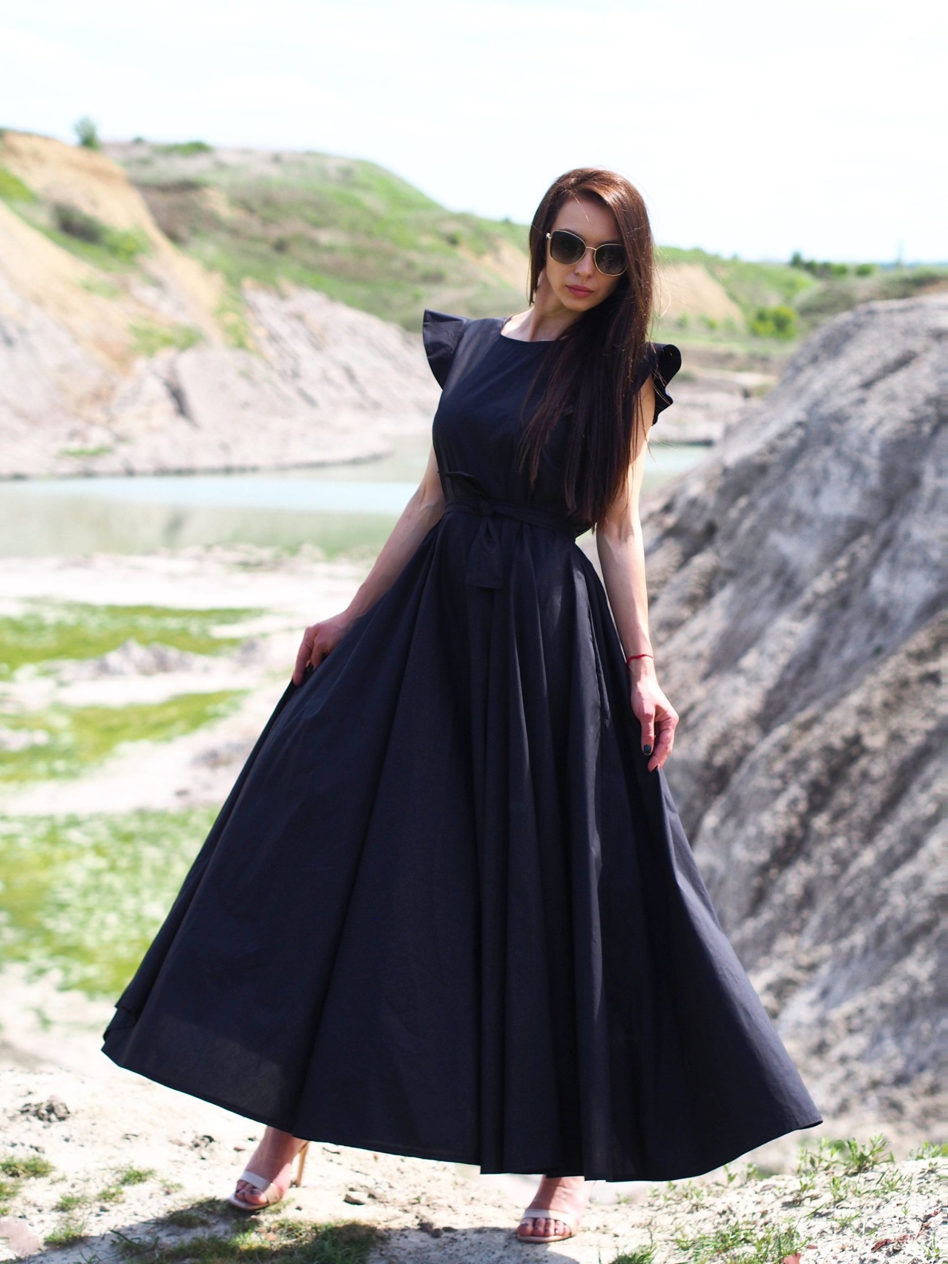 This elegant black maxi dress is a bold and graceful statement piece, crafted for women who want to stand out. Featuring dramatic ruffle sleeves, a fitted waist with a removable fabric belt, and a beautifully flared, voluminous skirt, this dress brings timeless sophistication to any event.