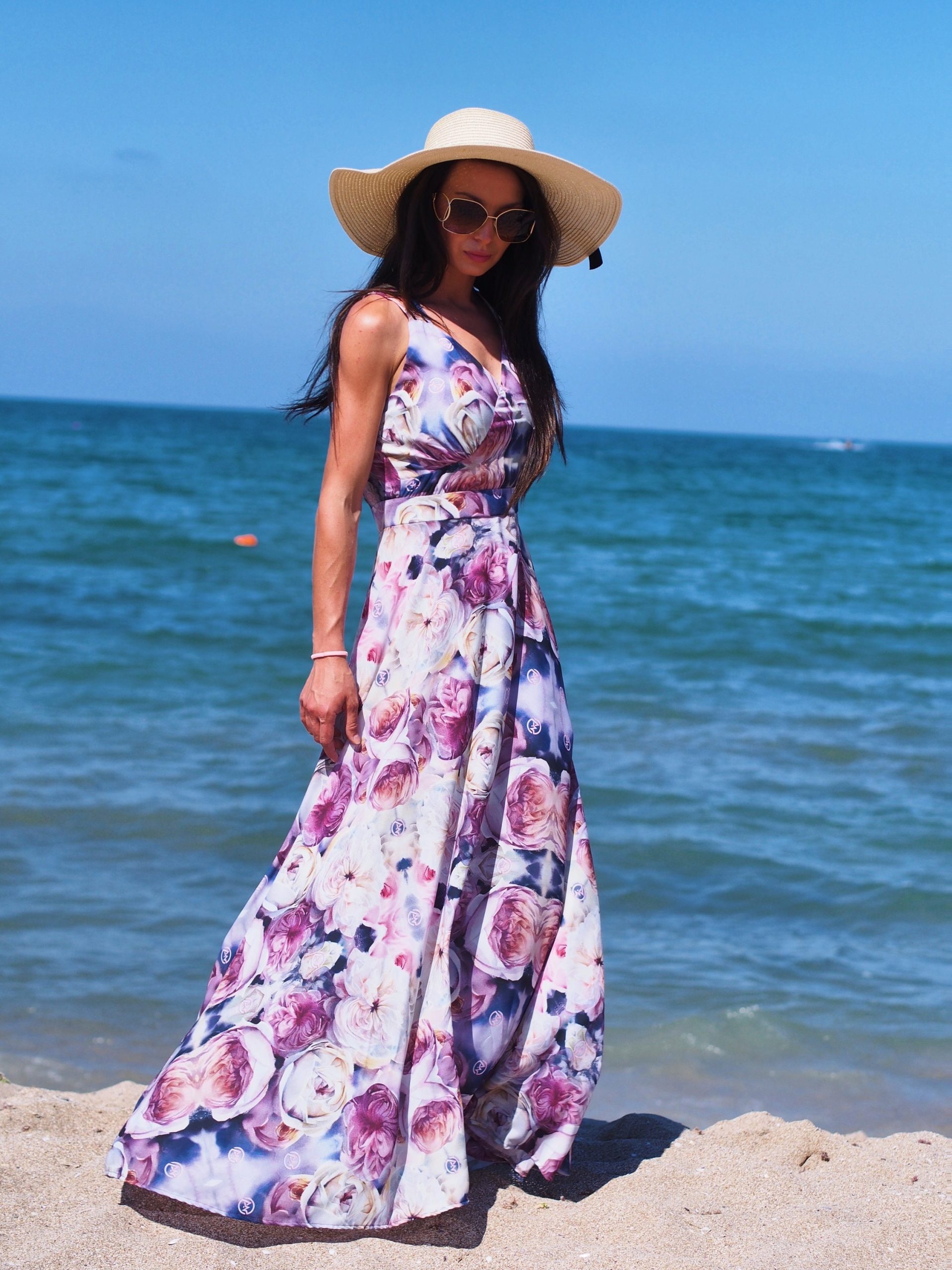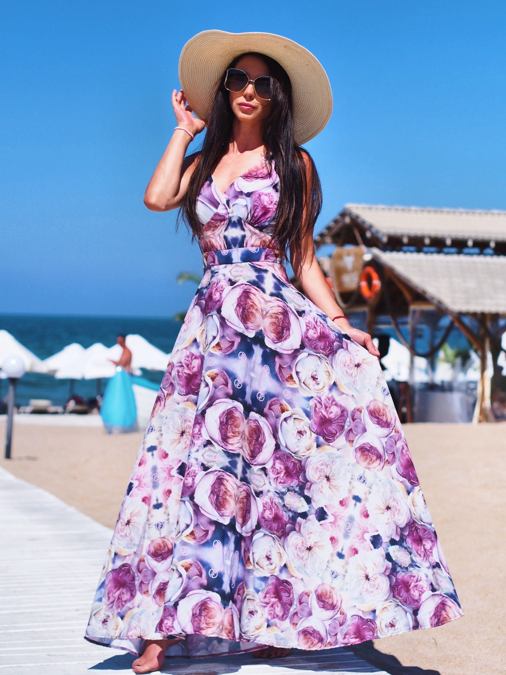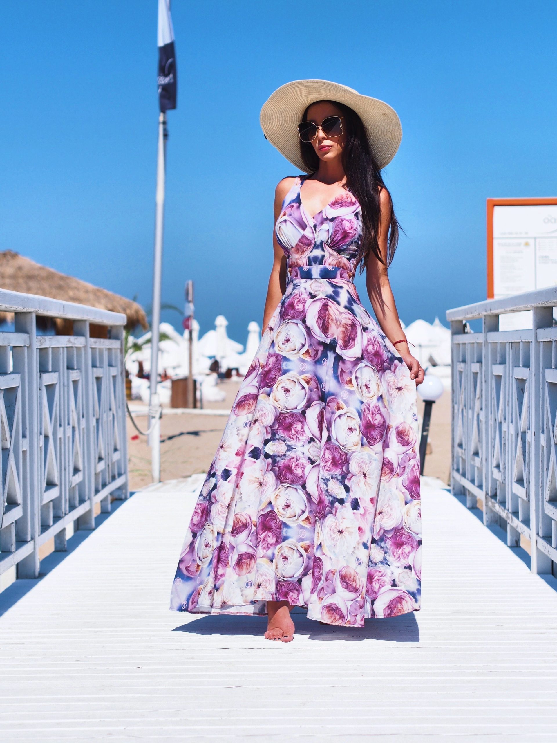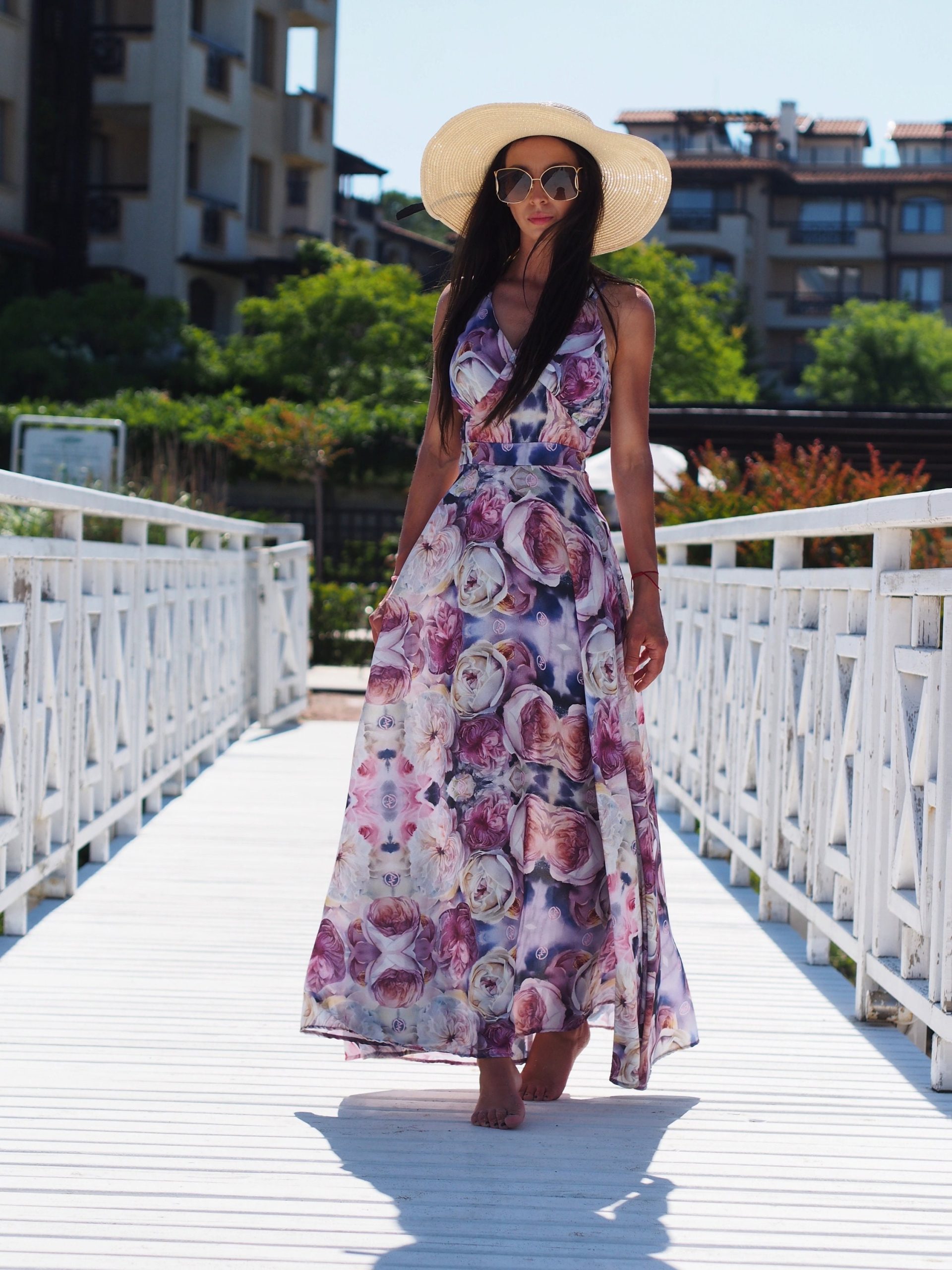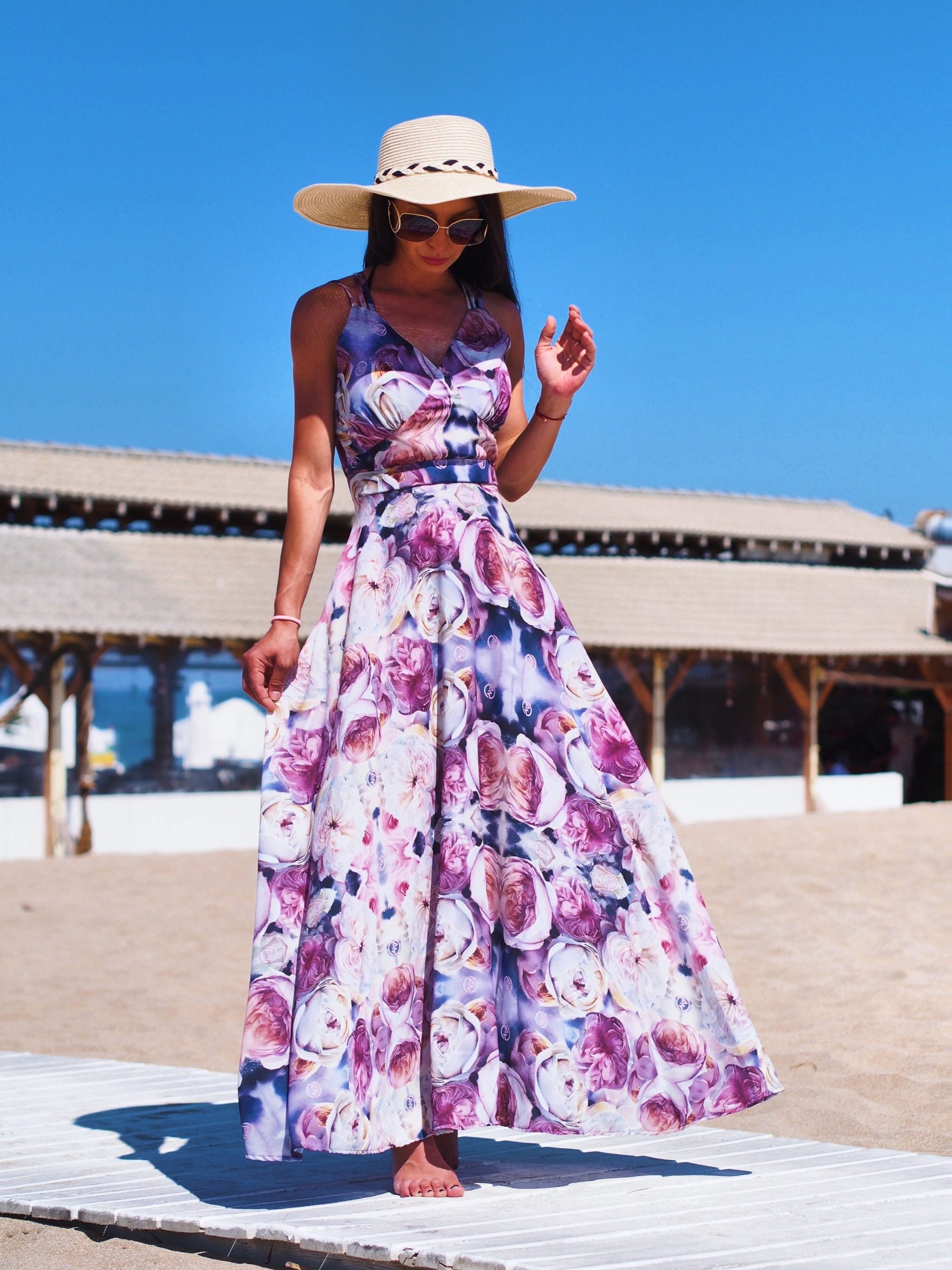 Feel like a goddess in this stunning floral maxi dress. Made from silky satin fabric, it flows gracefully with every step. The romantic peony print in soft pink and lavender tones adds elegance and charm, while the open back and fitted bodice enhance your silhouette.