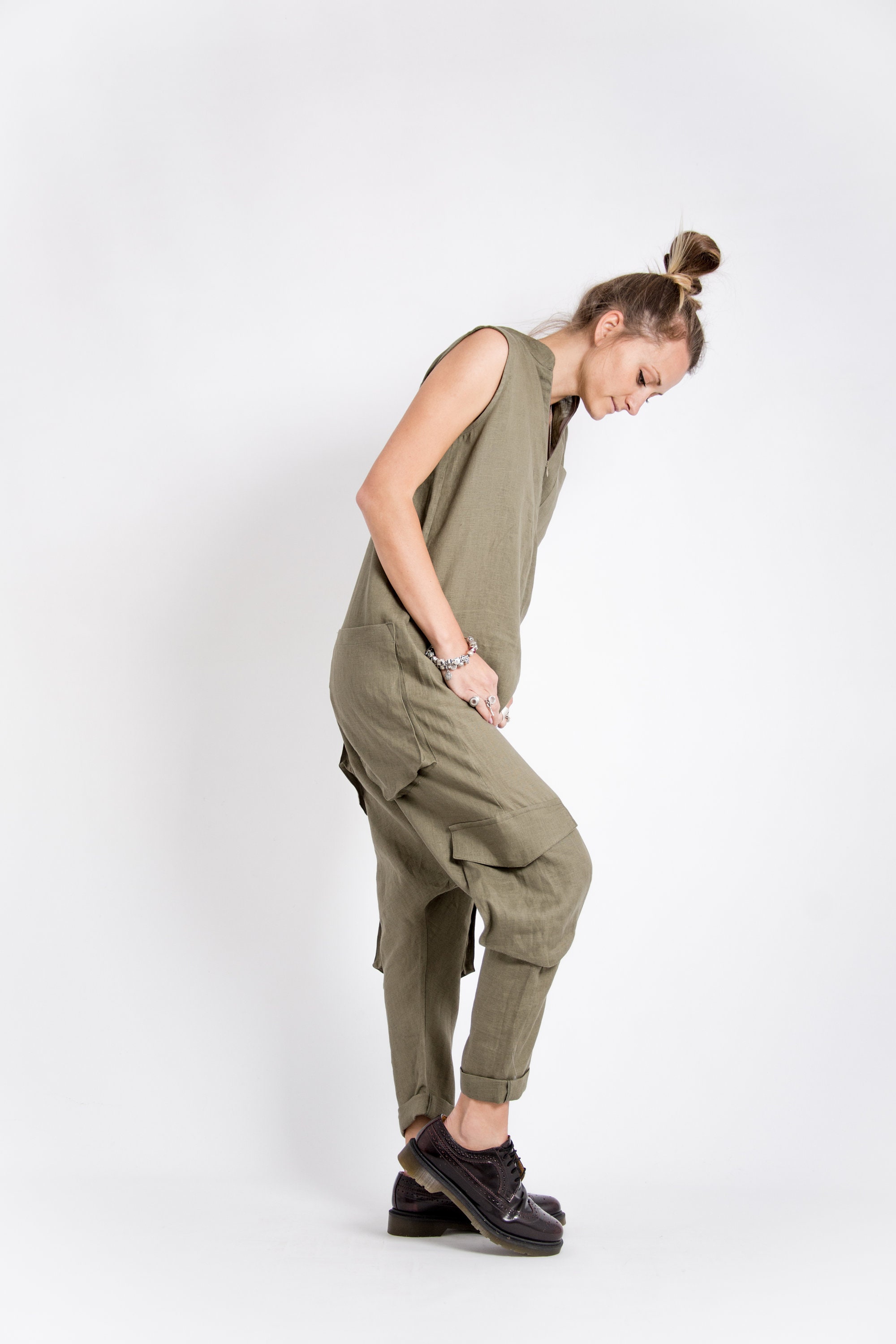 The linen jumpsuit women is extravagant, different and comfortable! It is a perfect option for those of you who love and appreciate the advantages of linen clothing. Our Khaki linen jumpsuit women is sleeveless and has playful pockets on both sides – on the legs and on the back side. Notice the design of the harem pants women – our wide leg jumpsuit has drop crotch pants, combines extravagance, modernity аnd comfort. Our linen jumpsuit women has a front zip fastening. This is an avant garde clothing designed for all body types!