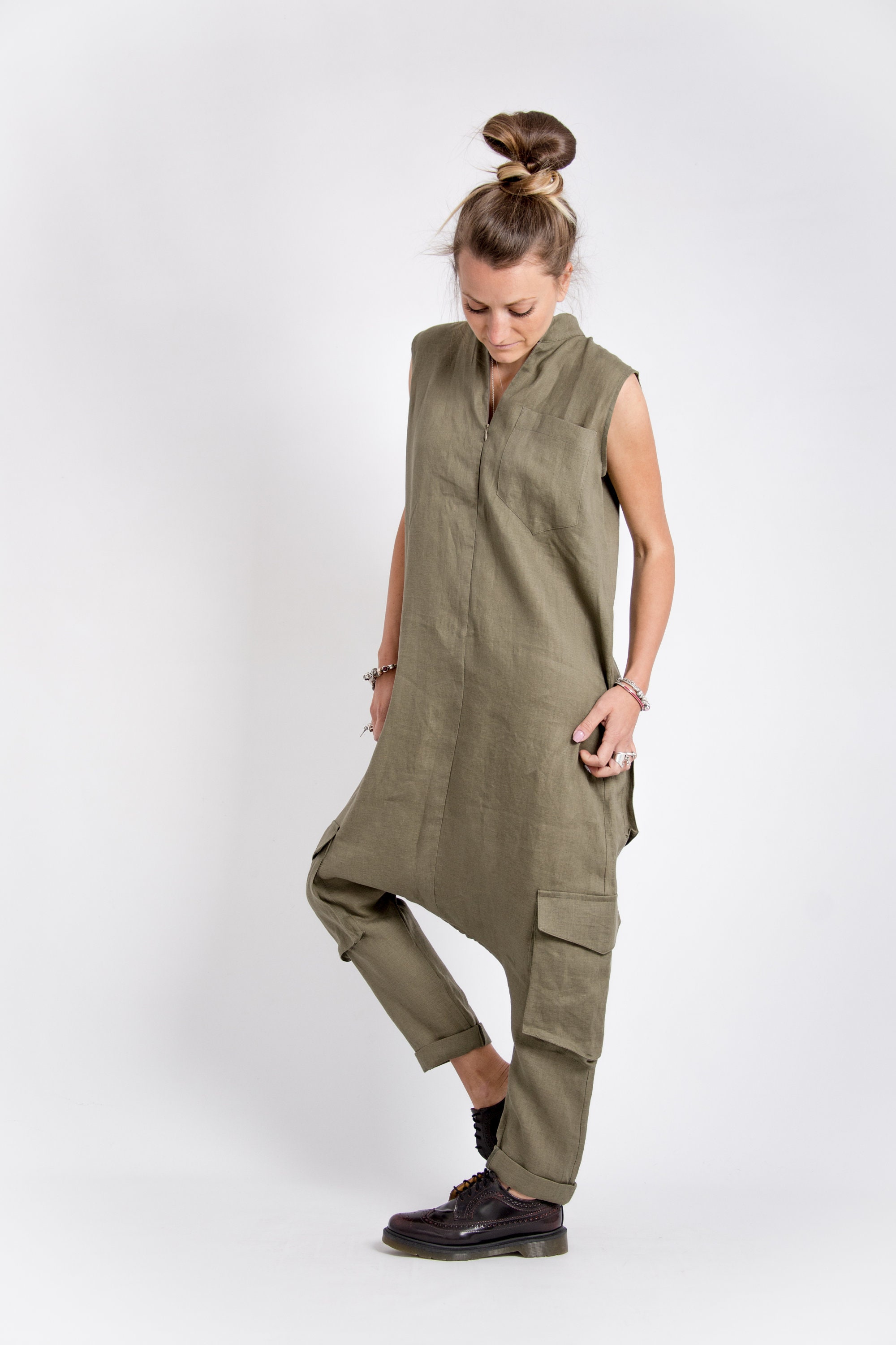 The Khaki jumpsuit is made for women who do not play by the rules. Our drop crotch pants are made for brave women who like uncommon clothing.