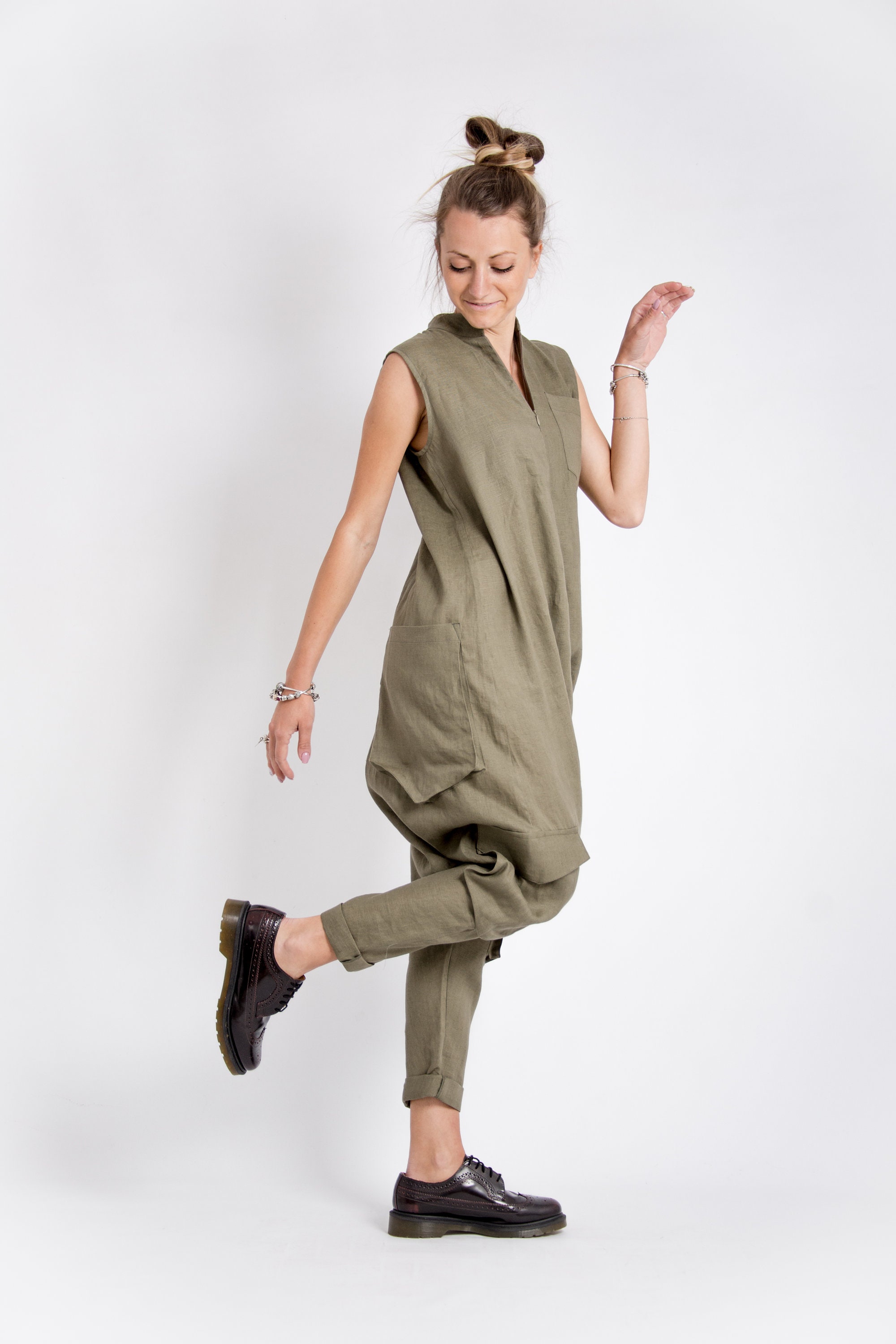 Another unique way to wear your favourite Khaki overalls women is by making sure your jumpsuit matchеs your shoes and accessories. That`s why we have created a flexible model of linen jumpsuit women which fits perfect with different type of shoes and accessories.