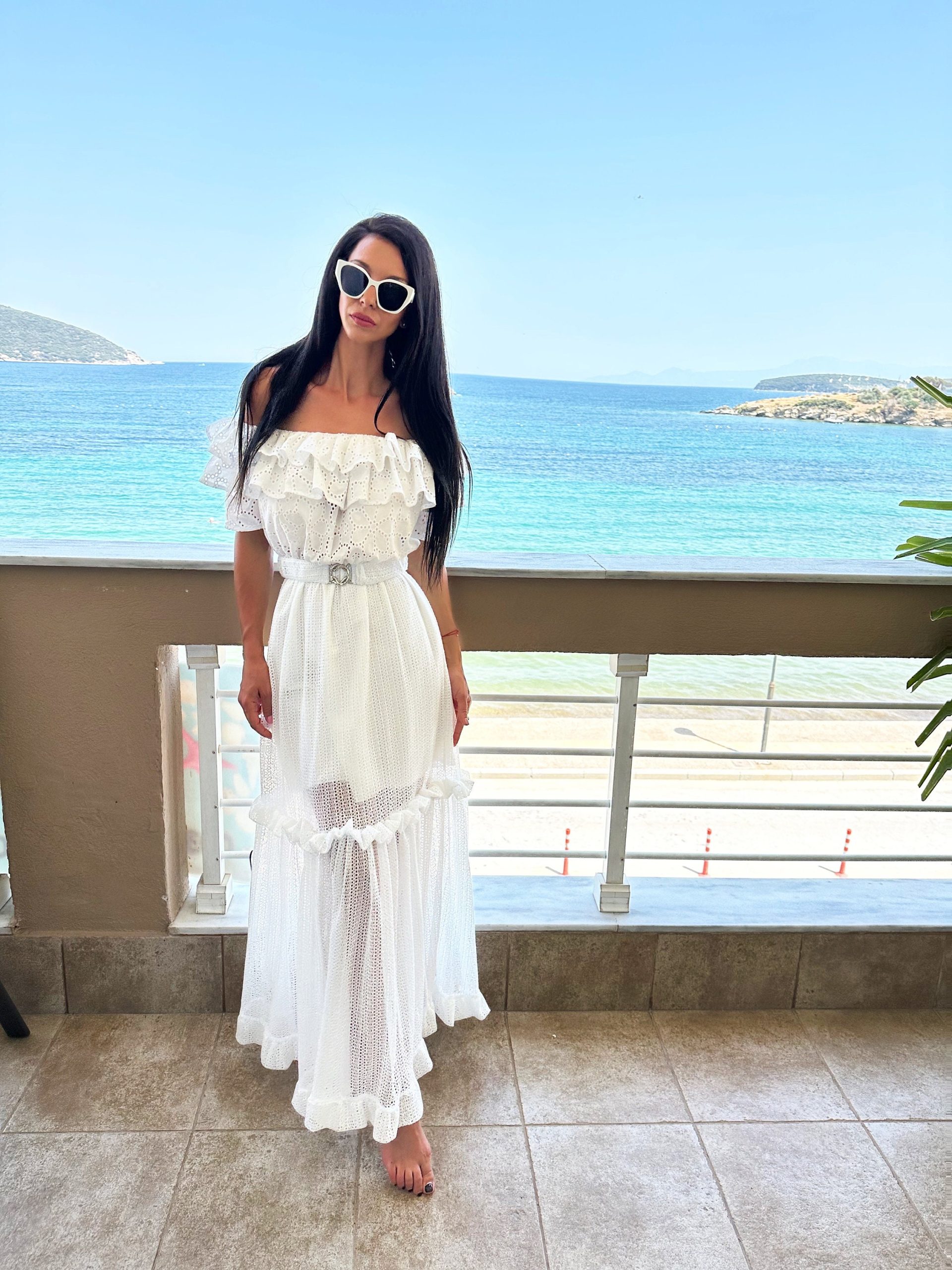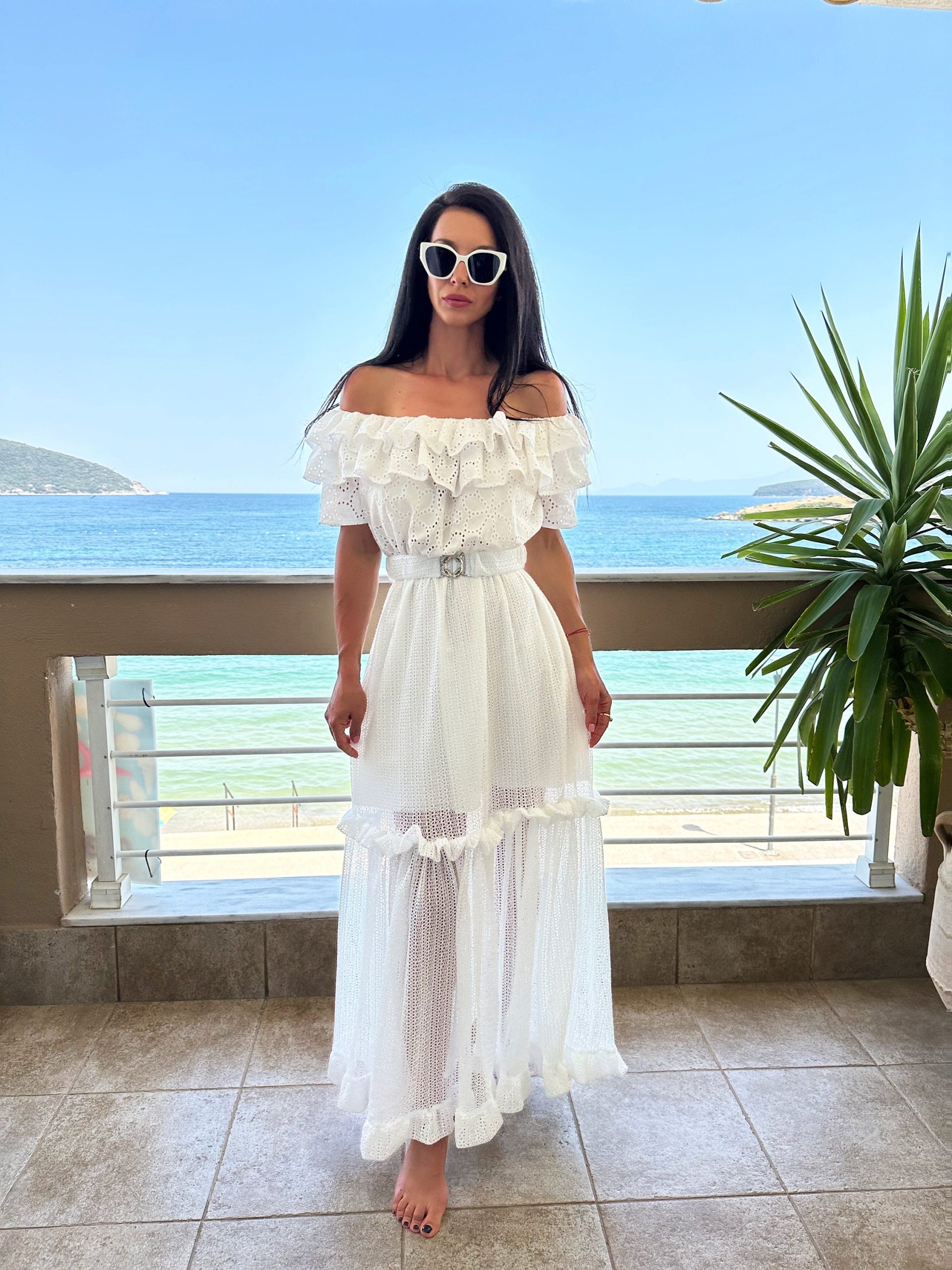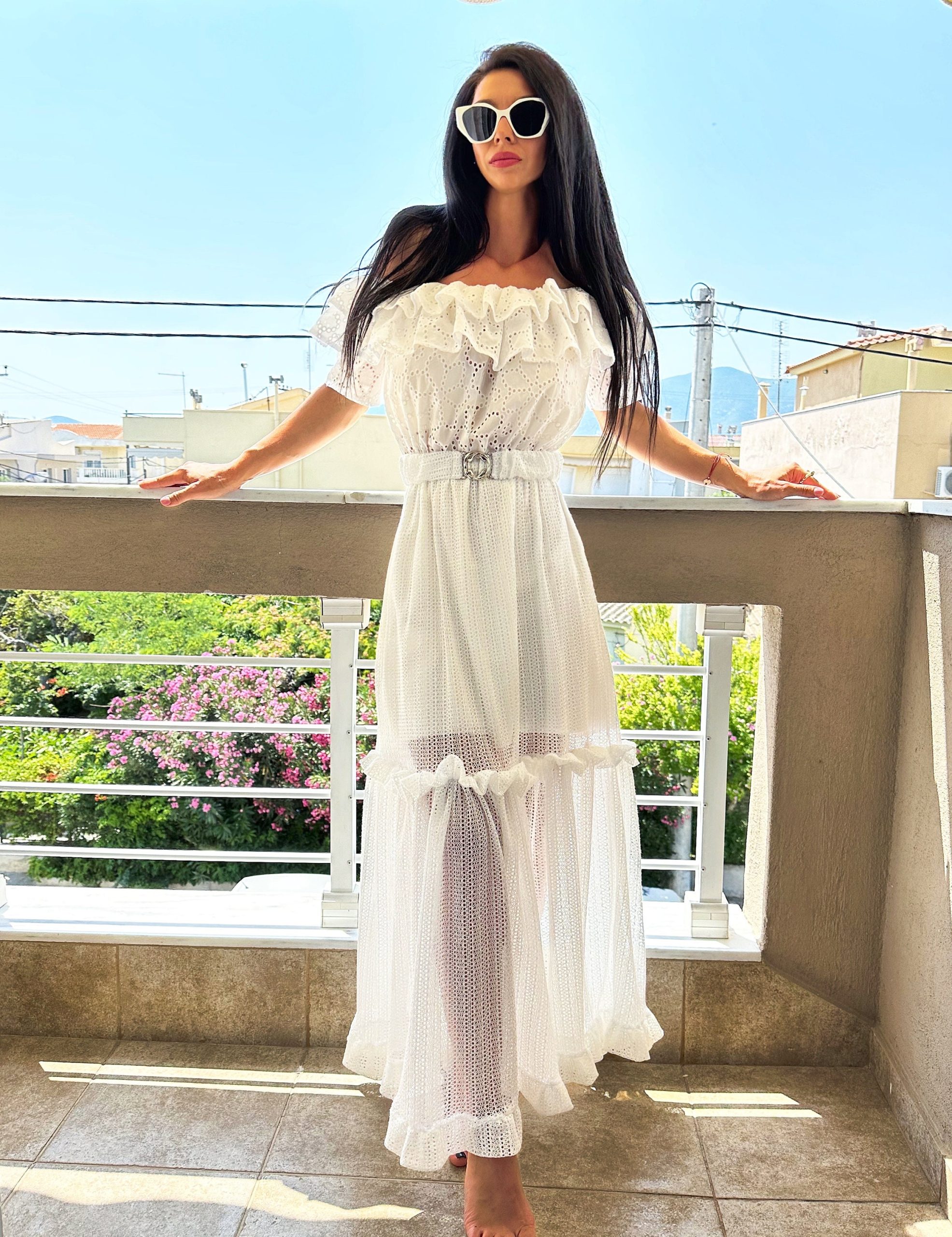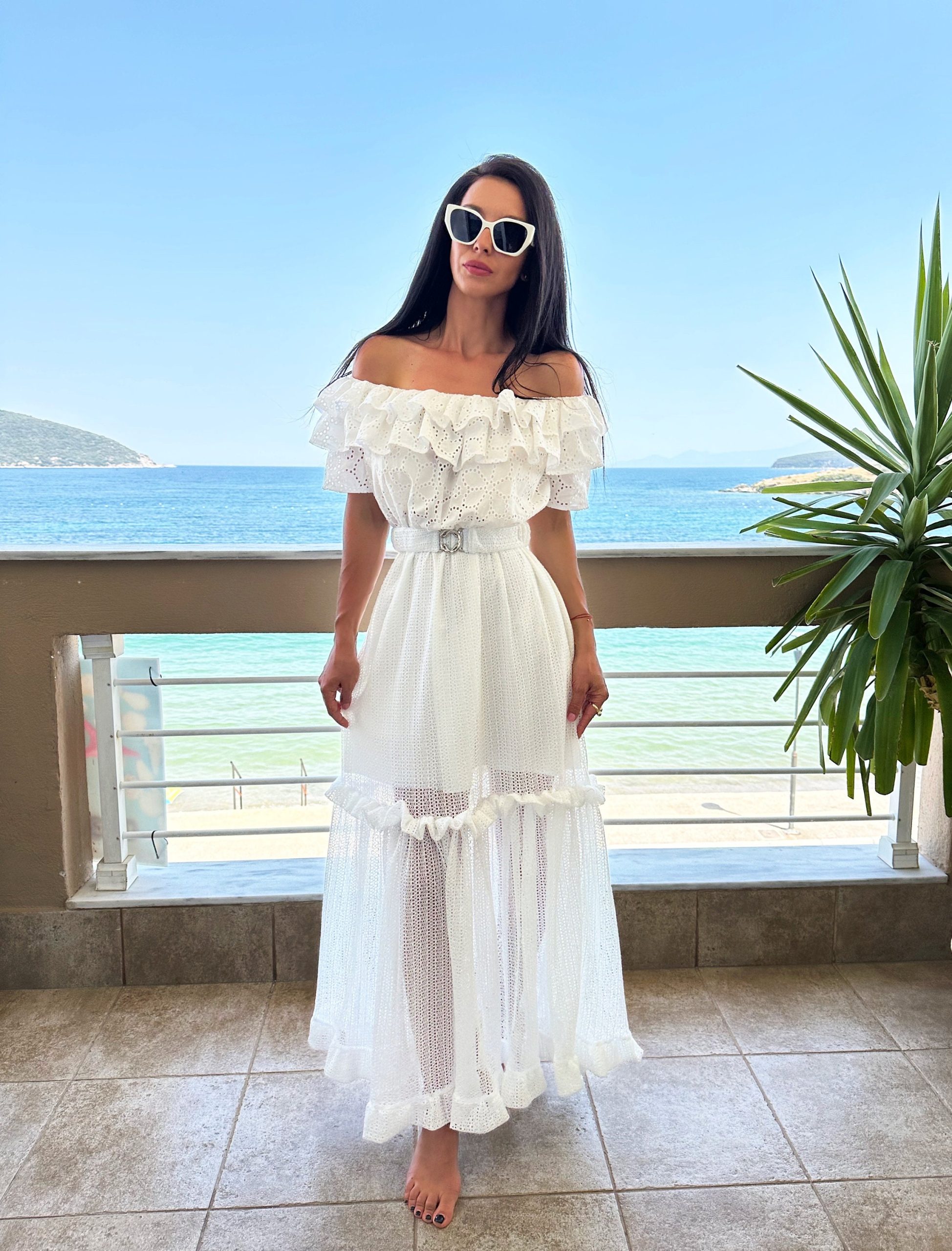 Fall in love with summer in this dreamy white off-shoulder maxi dress. Featuring delicate broderie anglaise (eyelet) fabric, romantic layered ruffles, and a soft sheer skirt with high-volume flow, this dress is perfect for beach strolls, vacation photoshoots, and effortless summer elegance. The matching belt cinches the waist for a flattering, feminine silhouette.
