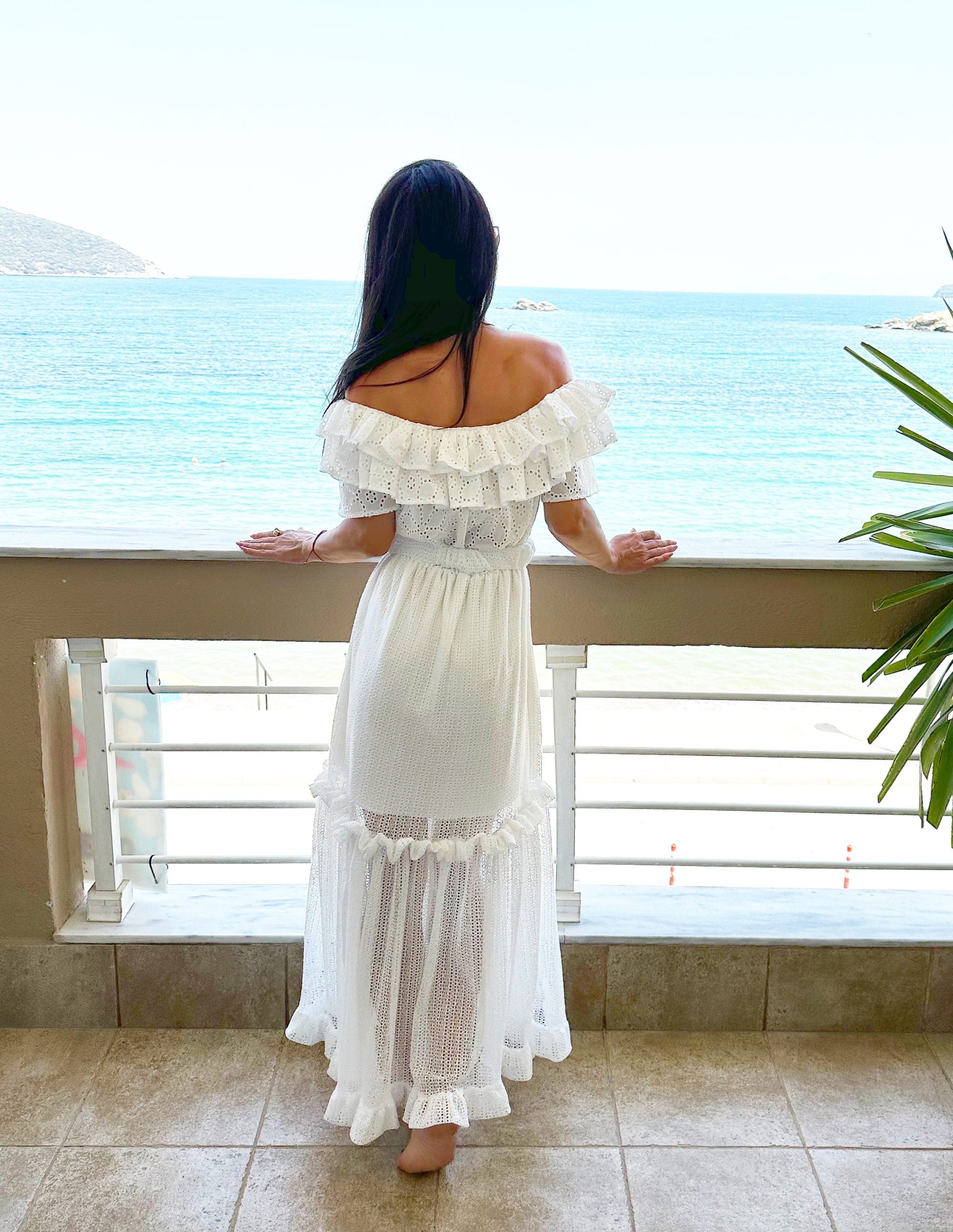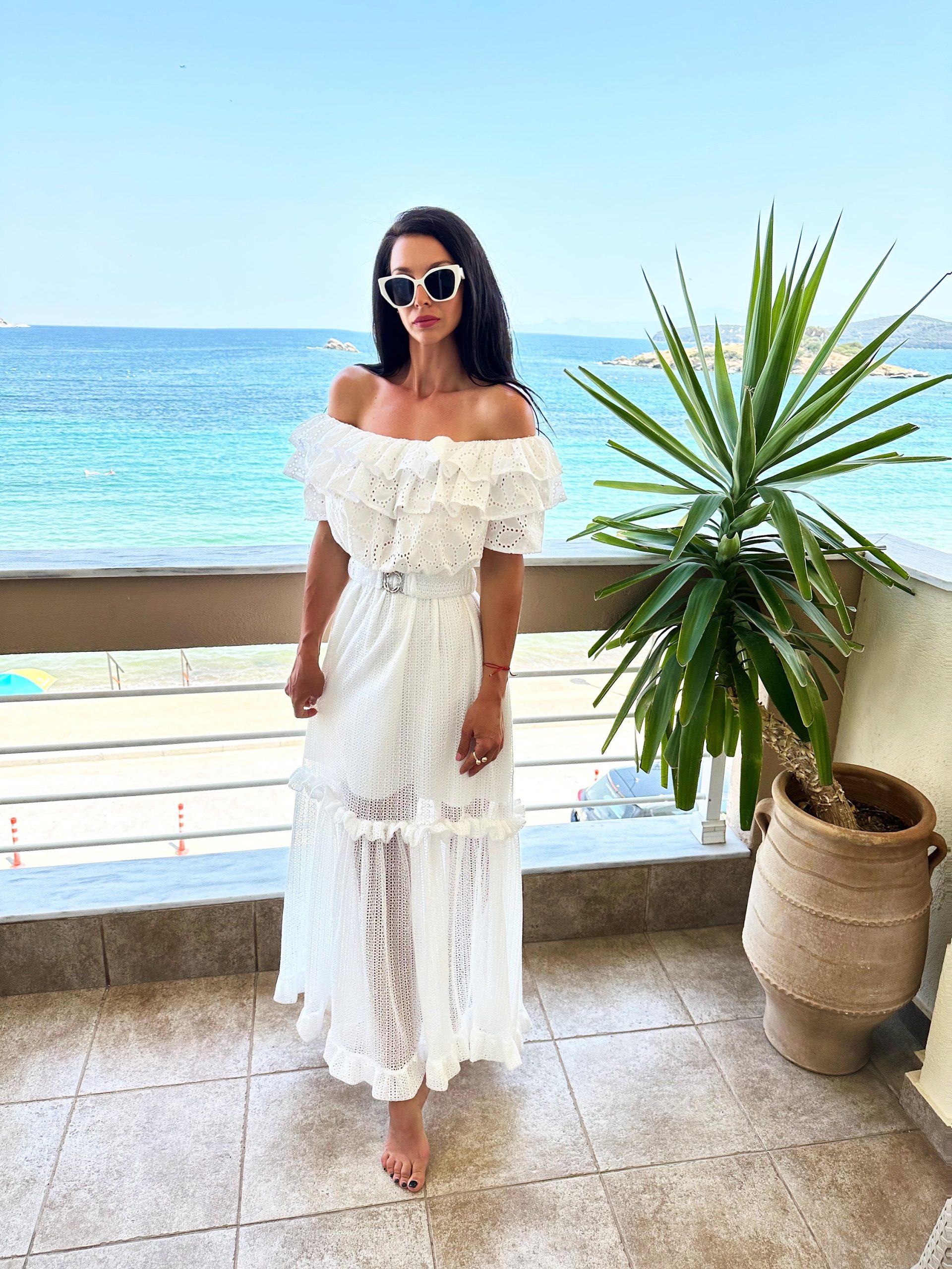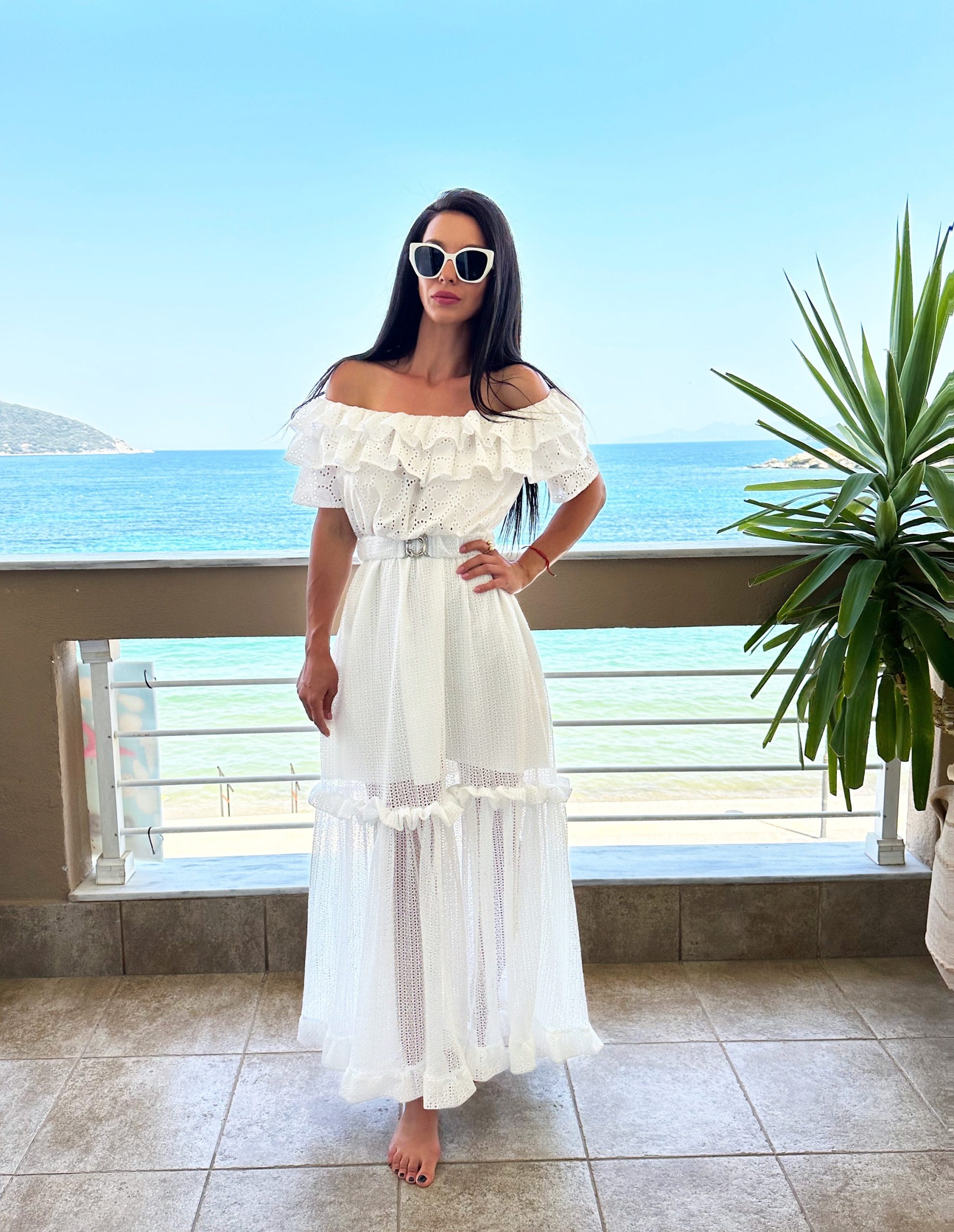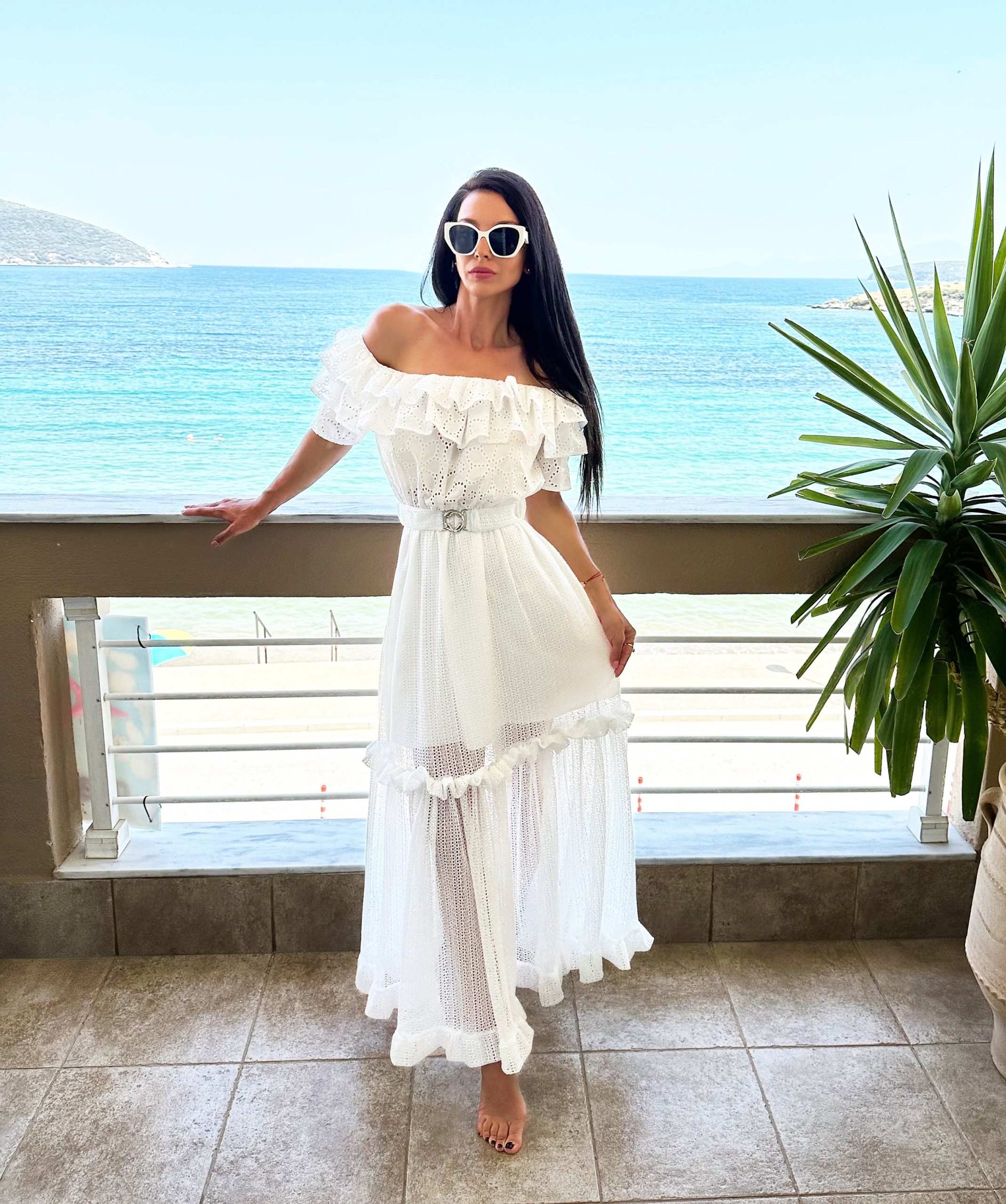 Fall in love with summer in this dreamy white off-shoulder maxi dress. Featuring delicate broderie anglaise (eyelet) fabric, romantic layered ruffles, and a soft sheer skirt with high-volume flow, this dress is perfect for beach strolls, vacation photoshoots, and effortless summer elegance. The matching belt cinches the waist for a flattering, feminine silhouette.