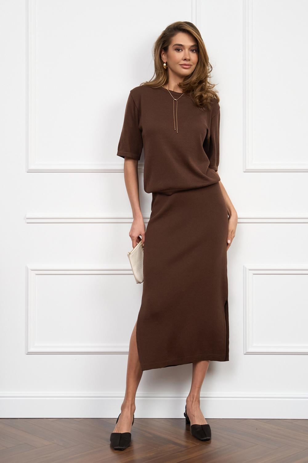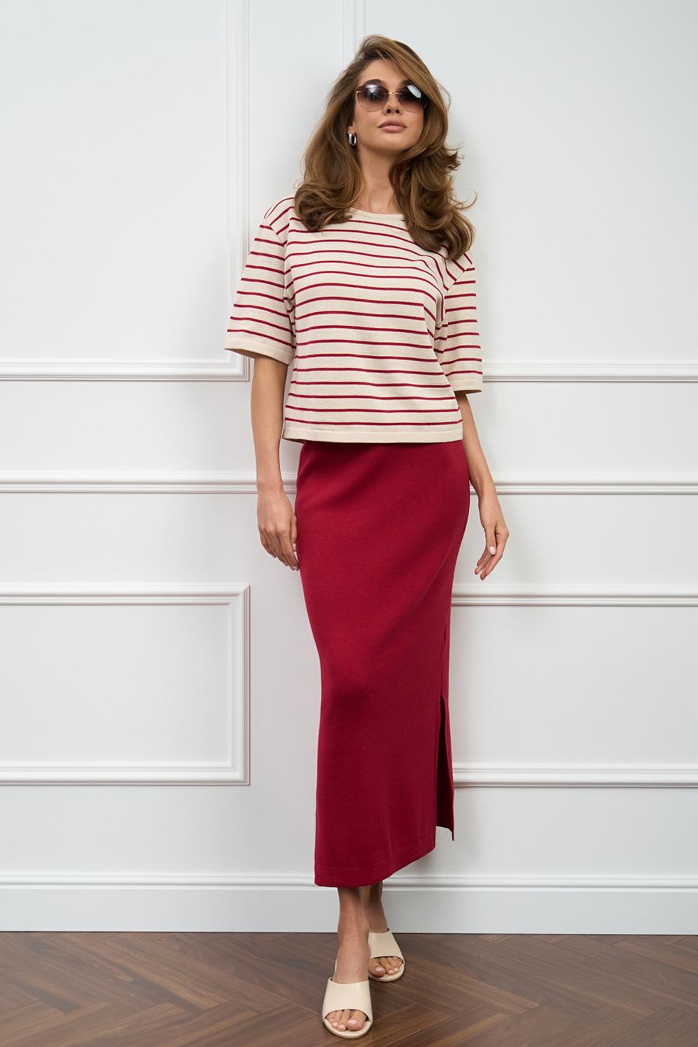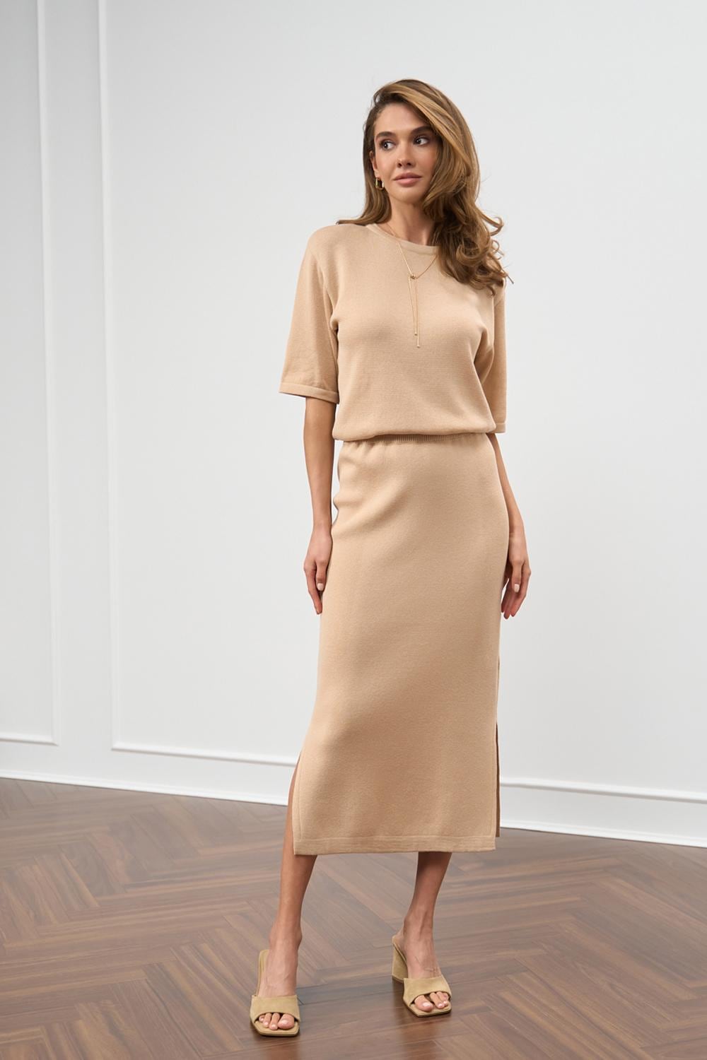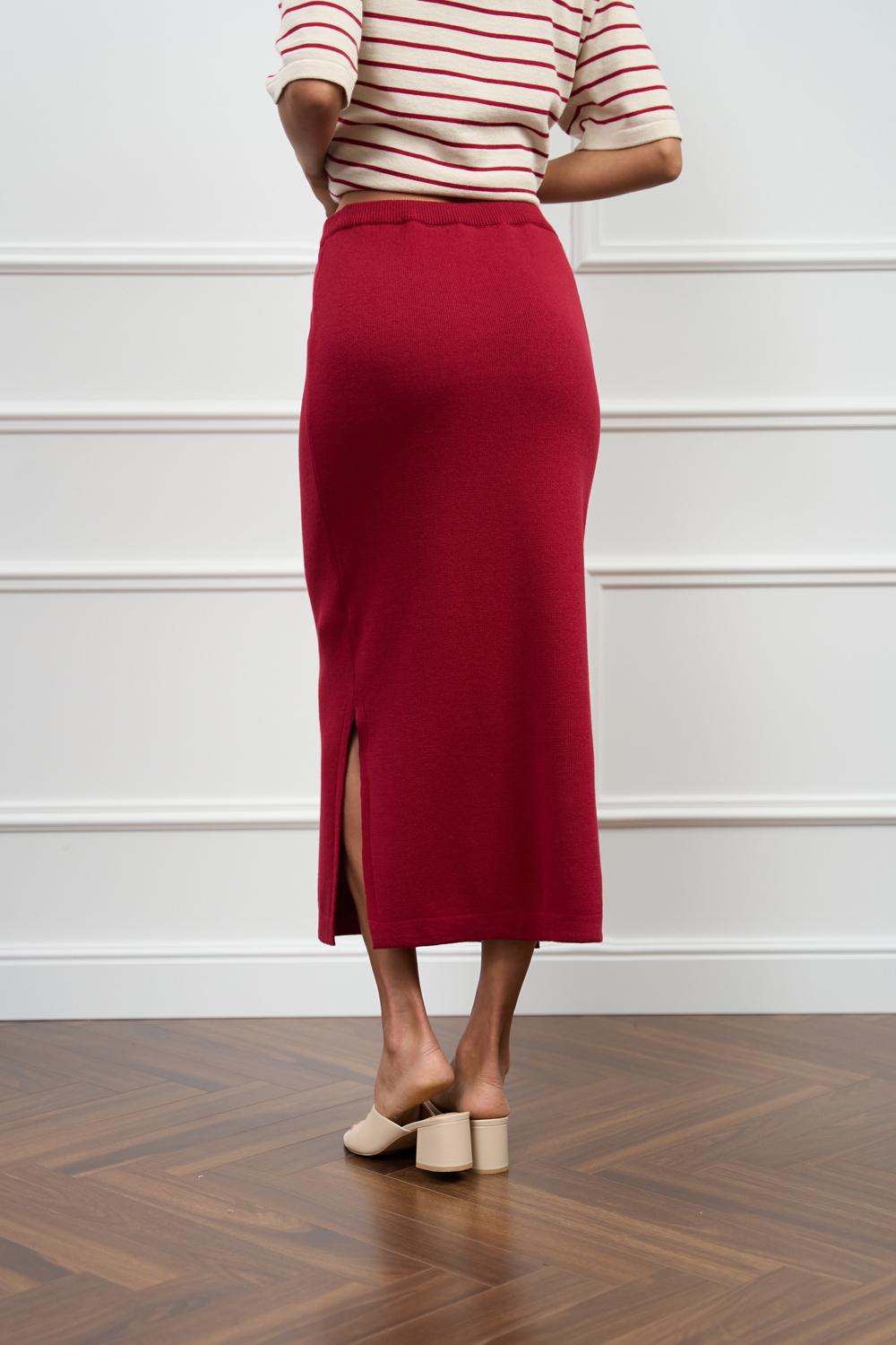 This knitted midi skirt is crafted from a premium natural yarn blend — viscose, cotton, and bamboo — for a smooth, breathable feel. Its straight silhouette and side slit create a flattering, elongating shape while offering freedom of movement.